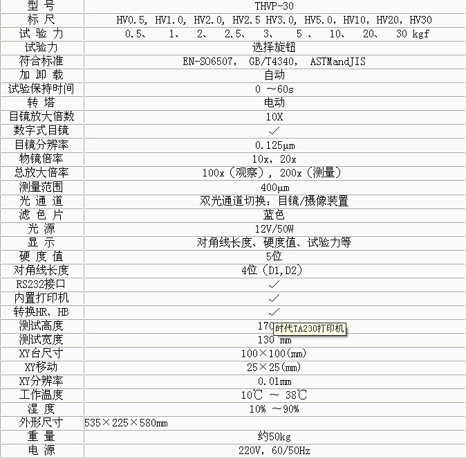 產(chǎn)品概述: 大屏數(shù)顯自動(dòng)磚塔維氏系列硬度計(jì)是光機(jī)電一體化的高新技術(shù)產(chǎn)品,顯示屏使用大的LCD屏幕,它造型新穎、美觀,,具有良好的直觀性、可操作性和可靠 性,是測(cè)試維氏硬度的理想產(chǎn)品。該機(jī)的壓頭和物鏡之間的轉(zhuǎn)換采用自動(dòng)切換裝置該機(jī)可測(cè)定鋼、有色金屬、IC薄片、薄塑料、金屬薄片、涂層、表面覆層、層壓 金屬、熱處理碳化層和淬火硬化層的深度與硬度梯度。 功能特點(diǎn): 1 、硬度計(jì)在機(jī)械上采用精密的結(jié)構(gòu)設(shè)計(jì),在光學(xué)上采用高倍率物鏡和數(shù)顯式測(cè)微目鏡,,測(cè)量光源采用冷光源等先進(jìn)技術(shù)。 2、采用閉環(huán)式加載控制系統(tǒng),使試驗(yàn)力精度提高,,示值的重復(fù)性及穩(wěn)定性佳。該系統(tǒng)用在維氏硬度計(jì)上,在國內(nèi)屬首創(chuàng)。 3、 操作由面板上的觸摸鍵輸入,能預(yù)置試驗(yàn)力保荷時(shí)間、調(diào)節(jié)測(cè)量光源的強(qiáng)弱、選擇維氏或努氏測(cè)試模式、硬度轉(zhuǎn)換標(biāo)尺、文件號(hào)與儲(chǔ)存等。并能在屏幕 上顯示測(cè)量壓痕長(zhǎng)度、硬度值、測(cè)量次數(shù)和年、月、日及時(shí)間等,試驗(yàn)結(jié)果和數(shù)據(jù)處理,并通過打印機(jī)輸出,還能通過RS232接口與計(jì)算機(jī)連接。硬度計(jì)還可根 據(jù)用戶特殊需求配置CCD裝置、視屏裝置和攝像裝置。 技術(shù)參數(shù):