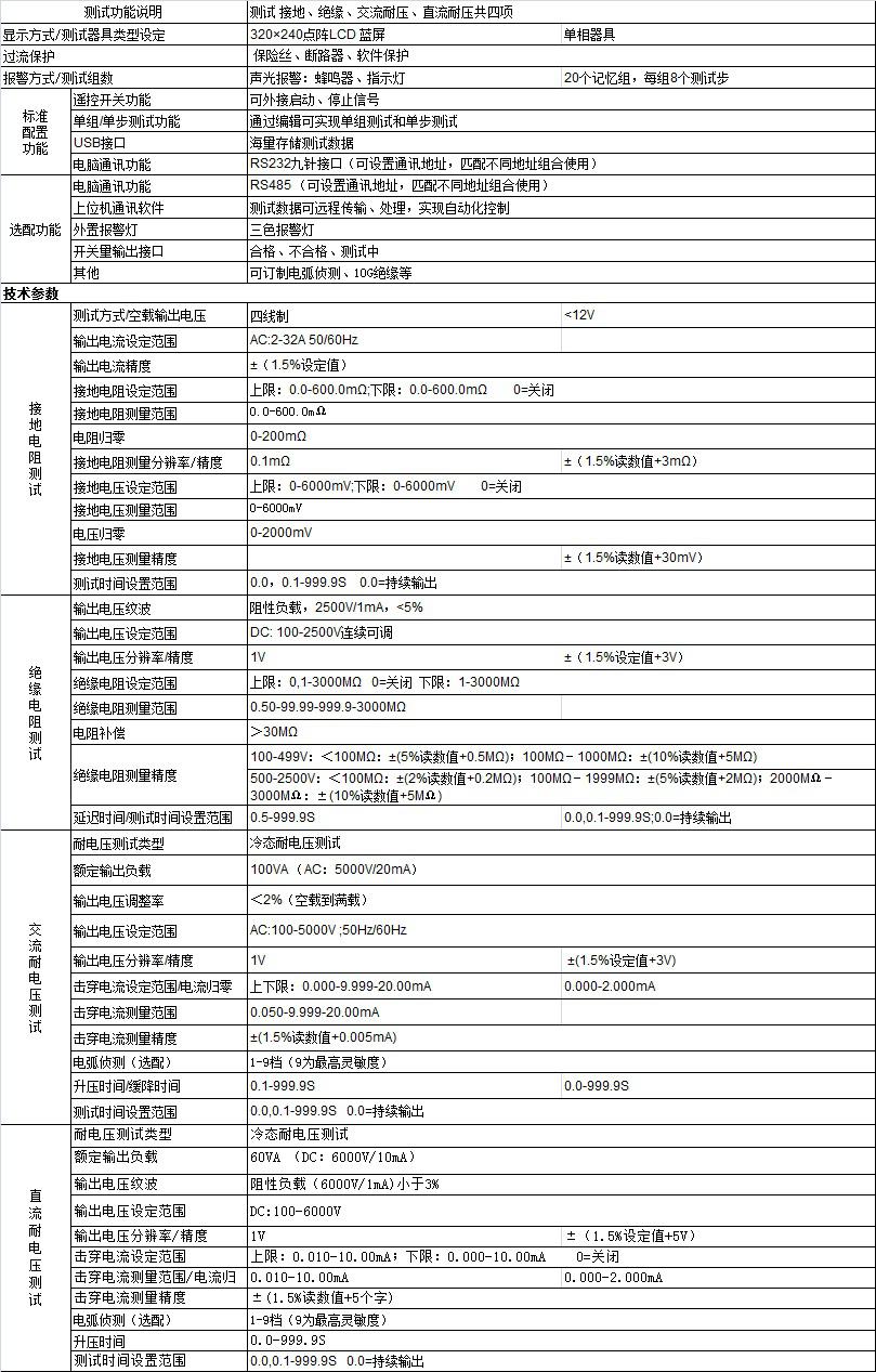 功能特點: 1. 緊跟新標(biāo)準(zhǔn)要求,五合一安規(guī)綜合測試儀,滿足各行業(yè)標(biāo)準(zhǔn)檢測:接地電阻測試電流最大到32A,安全綜合測試儀產(chǎn)品說明書,絕緣測試電壓最大到2500V; 2. 集成多種測試功能,機械電氣設(shè)備安全特性綜合測試儀,減少產(chǎn)線操作人員:測試系統(tǒng)集成了交流耐壓、直流耐壓、絕緣電阻、接地電阻等安全性能綜合測試,安全性綜合測試儀,一個工位,便攜式安規(guī)綜合測試儀,一鍵啟動,安全特性綜合測試儀,快速完成全功能檢測; 3. 20個測試組,安規(guī)綜合測試儀原理,可步組編程:適用于混合高效產(chǎn)線; 4. 測試速度快,安全綜合測試儀操作方法,四項功能測試2.5s完成; 5. 選配USB接口,程控安規(guī)綜合測試儀,實現(xiàn)測試結(jié)果海量存儲;