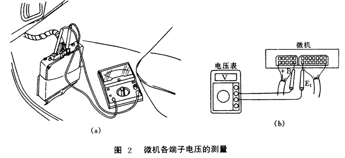 。4)必須在微機和線束連接器(插頭)處于連接的狀態(tài)下測量微機各端子的電壓并且萬用表的測筆應(yīng)從線束插頭的導(dǎo)線一側(cè)插入進行測量微機各端子的電壓(如圖 2所示)。
