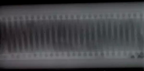 可見利用X射線照相檢測(cè)方法對(duì)該型號(hào)空速管進(jìn)行檢測(cè)不可能實(shí)現(xiàn)對(duì)整圈加熱絲一周焊接狀況的檢測(cè)因?yàn)槊恳淮瓮刚罩荒軝z測(cè)每圈加熱絲與射線束相切部位的這極少的部分。如果要利用X射線照相檢測(cè)方法對(duì)加熱絲整圈焊接狀況進(jìn)行檢測(cè)那么將對(duì)技術(shù)和生產(chǎn)效率帶來(lái)極大的挑戰(zhàn)。